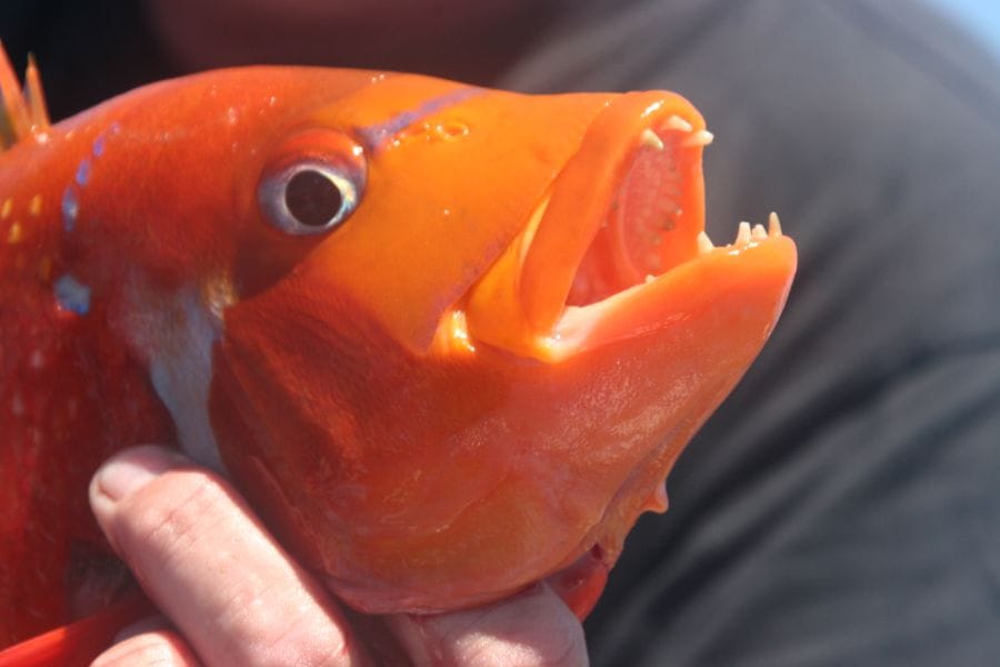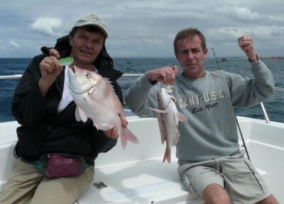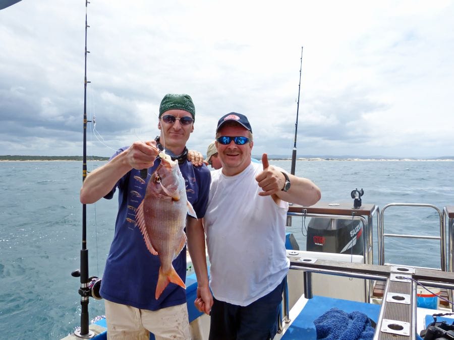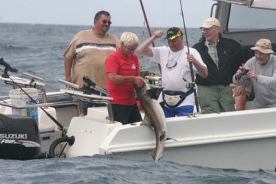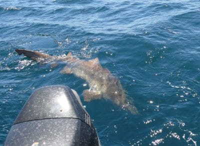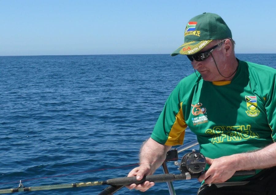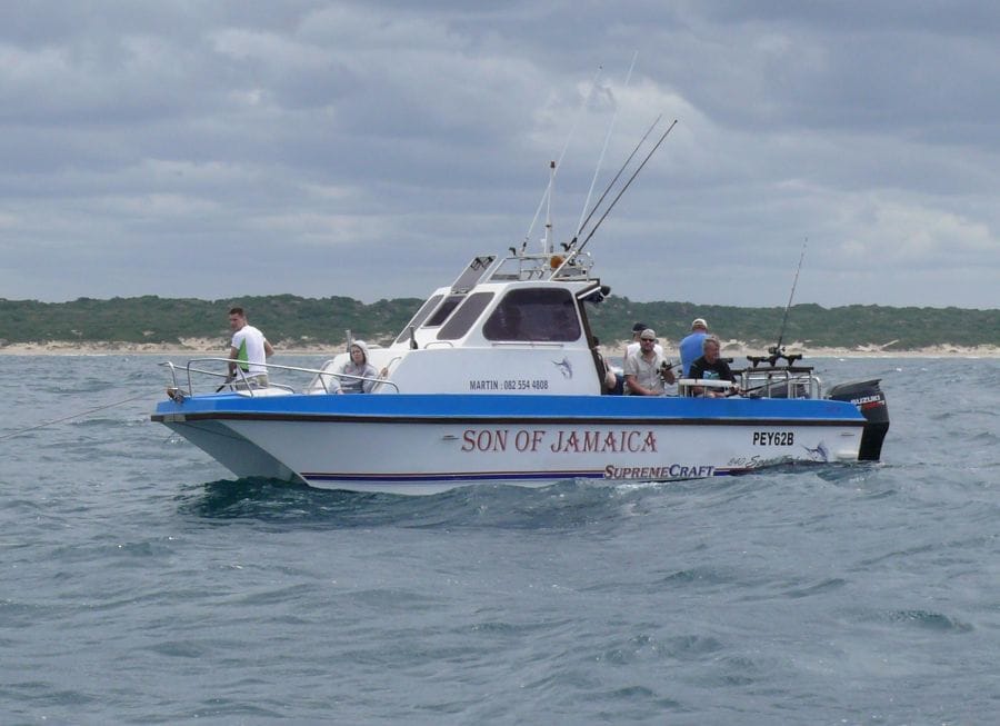 Vihdoin pääsimme lähtemään merelle. Katamaraaniamme vauhditti kaksi 150 hv Suzuki moottoria. Matkallemme osui kalliosaari, jossa näkyi tuhansia pingviinejä. Ajoimme noin 20 km suurten delfiiniparvien seuratessa. Delfiinejä oli satoja. Veneet ankkuroitiin näköetäisyydelle toisistaan 25 m matalikolle. Veneissä oli kipparin lisäksi apumies, joka leikkasi mustekalat koukkuihin syöteiksi. Myös syöttikaloja käytettiin. Jokaisella meistä oli oma vapa ja pudotimme koukun syötteineen pohjaan painon kanssa. Pian veneen vieressä veden pintaa piirsi selkäevä. Vasarahai tuli uteliaana venettä tutkimaan. Jokaisella meistä vavoissa kävi nykyjä, mutta koukut nousivat ilman kalaa ja syöttiä. Ja syöttejä katosi koukuista, kunnes pikkuhiljaa huomasimme kuinka kalan saa tarttumaan koukkuun. Syötti pohjaan ja kun nykii niin nostetaan syötti hitaasti ylös kunnes kala tarttuu. Nopealla nykäisyllä tuli tyhjää. Kalaa alkoi nousta veneeseen, monen kokoista ja väristä kilosta korkeintaan viiteen kiloon. Nyt selvisi, miksi syötit katosivat nopeasti koukuista. Kaikilla kaloilla oli isot ja terävät hampaat. Oppaat mittasivat kalat , pienet heitettiin takaisin ja täysmittaiset otettiin kyytiin. Kalalaatikossa ei muuten ollut jäitä. Silloin tällöin siimaa lähti vauhdilla kelalta, jarru oli tiukalla ja piti olla hereillä ettei mies tai vapa mene yli laidan. Siima sitten usein katkesi. Keskipäivällä Kittilän miehen vapaan tarttui jotakin suurta. Mies tuumasi, ettei tämmöistä ole ikänä vavassa pidellyt varsinkaan Lapissa. Me muut nostimme ovat siimat ylös sotkujen välttämiseksi. Puolen tunnin tiukan taistelun jälkeen pintaan nousi yli 2-metrinen ja 60 kilon hietahai koukku suupielessään. Aika karmean näköinen otus. Kun apumies leikkasi veitsellä siiman poikki koukun vierestä, yhtäkkiä hai yritti haukata miestä kädestä. Läheltä piti. Pudasjärven miehen koukkuun tarttui vielä 10-kilon hai ja minulle 20-kilon ja 140 cm pitkä hai. Puolelta päivin alkoi maininki ja aalto nousta hiljalleen. Takaisin satamaan lähdettiin jo aikaisin iltapäivällä. Meidän veneeseemme kaloja otettiin n. 20 kpl, keskipaino 2 kg ja toiseen lähes saman verran. Saaliskaloja olivat skottsman, carpenter, red snapper, kob ja sandsoldier.