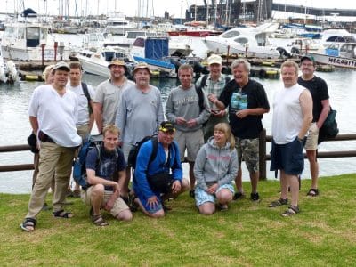 12. helmikuuta iltapäivällä kokoontui Helsinkiin lentokentälle 17 hengen seurue, johon kuului 11 miestä ja 6 naista. Inarin Uistelijoita oli matkaajista 8 henkeä. Illalla lensimme Lufthansan Airbus A320:lla Saksaan Frankfurtiin. Siellä vaihdoimme maailman suurimpaan lentokoneeseen Airbus A380:een. Olihan sekin kokemus lentää jätillä 10 tuntia yön yli Etelä-Afrikkaan Johannesburgiin. Aamulla olimme Afrikassa, jossa oli lentokentällä tosi avuliaita mustia oppaita. He opastivat pyytämättäkin seuraavan lennon portille, vaativat pientä korvausta 50 m matkasta ja nappasivat kädestä tai lompakosta sopivaksi katsomansa summan, aika kallista opastusta. Vielä lennettiin Johannesburgista tunti ja 40 minuuttia Port Elizabethiin.