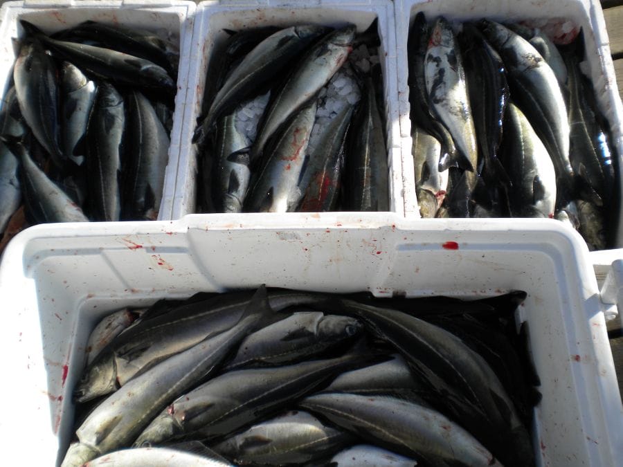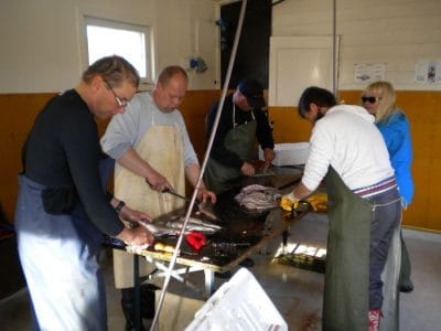 Edessä oli vielä neljän tunnin urakka ennen kuin kalat oli perattu, fileroitu ja pussitettu Vesan ohjeiden mukaisesti. Petri pestattiin ruuan laittajaksi ja hyvät sapuskat oli mies laittanutkin. Päästiin vielä vähän kehaisemaankin kalasaaliilla, kun kokeneet, aiemmin meitä arvostelleet kalastajat tulivat muutaman kalan kanssa laituriin. Ilta kului rattoisasti päivän tapahtumia kertaillen ja huomista kalastusta suunniteltaessa.
