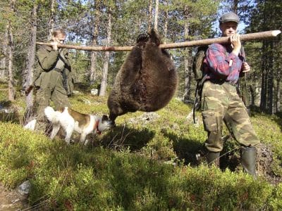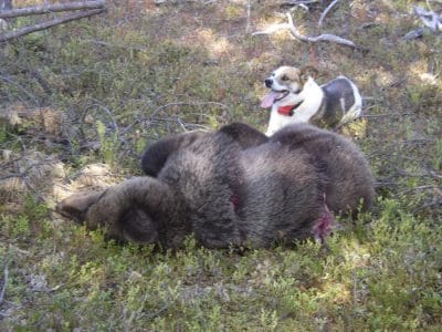Vuosikausia karhua pyytäneenä tuli pari vuotta aiemmin ajatus hankkia sellainen koira, että ”karhulla nahka löysällä”, joten otin Aatun. Aatun sukurasite karhulle on melkoinen, mutta siinä kaadolla tuli mieleen, että missä se Aatu nyt on kun ei näy? Katselin ympärilleni, niin jossakin 50m:n päässä mättäiden takana vilahteli mustaa. Tottapa tulee, kun aikansa värkkää. Vaan, eipä näkynyt sen koomin. Suolistimme karhun ja kannoimme korennossa tienvarteen. Kävelin tietä kilometrin autolle, mutta Aatu ei ollut sielläkään. No, metsäkö sen nieli? Kävelin vielä takaisin karhunkaatopaikalle, niin siellähän se Aatu tutki suoliläjää. Liekö pelästynyt ampumista vai mitä lie värkännyt, kun ei aiemmin uskaltanut paikalle.