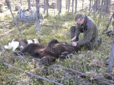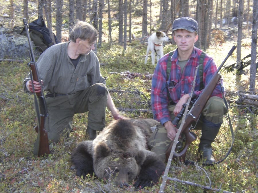 Seurasin karhua kiikarin yli ase valmiina. Kun karhu siirtyi riittävästi pois linjalta, niin hain laukkaavan karhun ristikkoon. Karhun täyttäessä koko kiikarin näkökentän yritin hakea sopivaa ennakkoa. Laukaus tuntui jäävän väkisin hieman taakse, mutta minkäänlaista vaikutusta en havainnut karhussa. Nopea latausliike, tähtäys ja laukaus.. ei havaittavaa vaikutusta… menikö ohi…ei per.. karkaako se… käväisee ajatus mielessä. Kolmas laukaus lähti kuten edellisetkin laukkaavaan karhuun suoraan sivulta. Silloin karhu kierähti voltin ja jäi paikoilleen kuperkeikkaa heittämään. ”Älä ammu enää, ei karkaa” huusi Ate. En luottanut kaveriin vaan ammuin vielä kerran, jolloin karhun liike lakkasi täysin. Latasin aseen lippaan täyteen ja lähestyin karhua takapuolelta ase ampumavalmiina. Karhu makasi kyljellään täysin liikkumatta. Tökin karhua kiväärin piipulla useamman kerran, eikä elonmerkkejä ollut havaittavissa, vaikka silmään tökkäsi. Jimikin haisteli karhua häntää heiluttaen. Karhu oli kuollut. Metsämiehen suurin unelma oli käynyt toteen, olin päässyt kaatamaan karhun oman koiran haukusta.